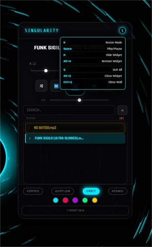 Singularity Music Widget – Transform your music into mesmerizing visuals! Run the app on Windows, add your favorite tracks, and watch particles react to every beat and drop in real time. Perfect for any music style, from calm lo-fi to energetic EDM.